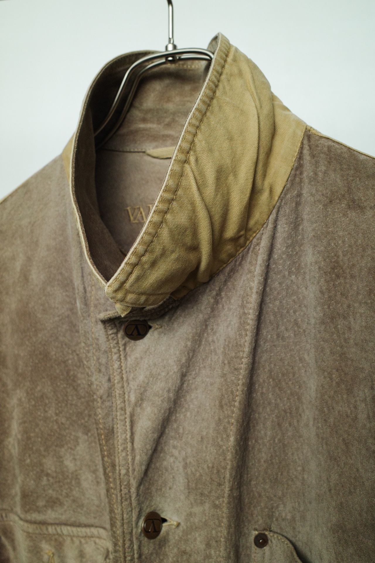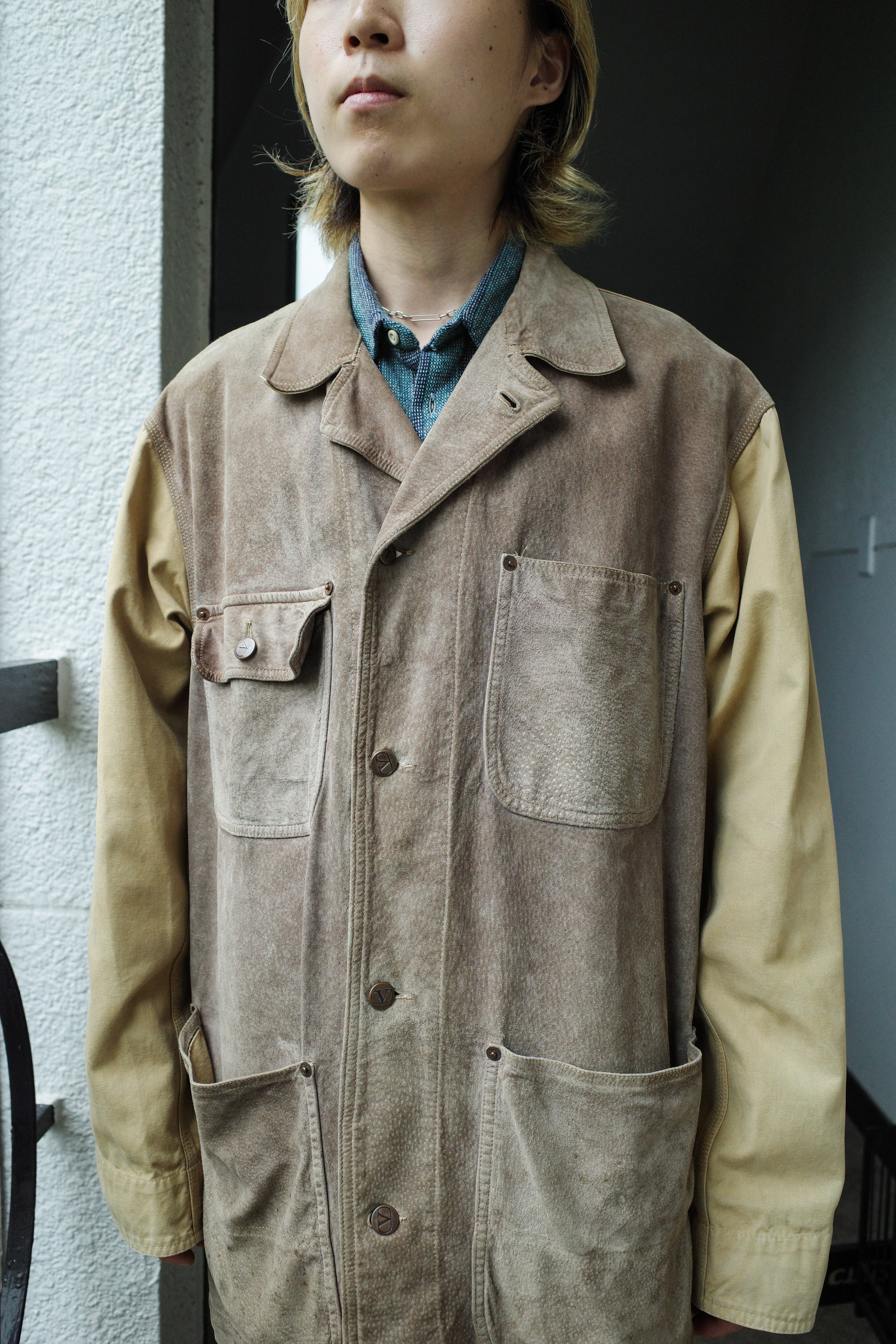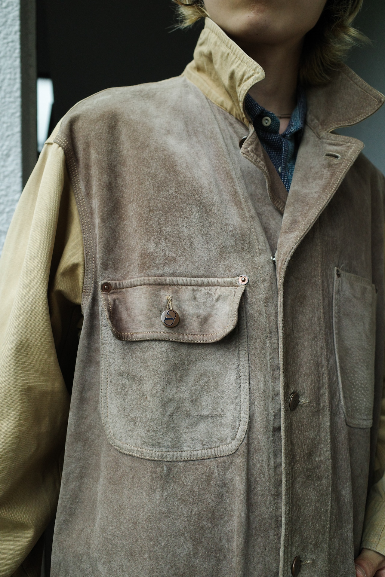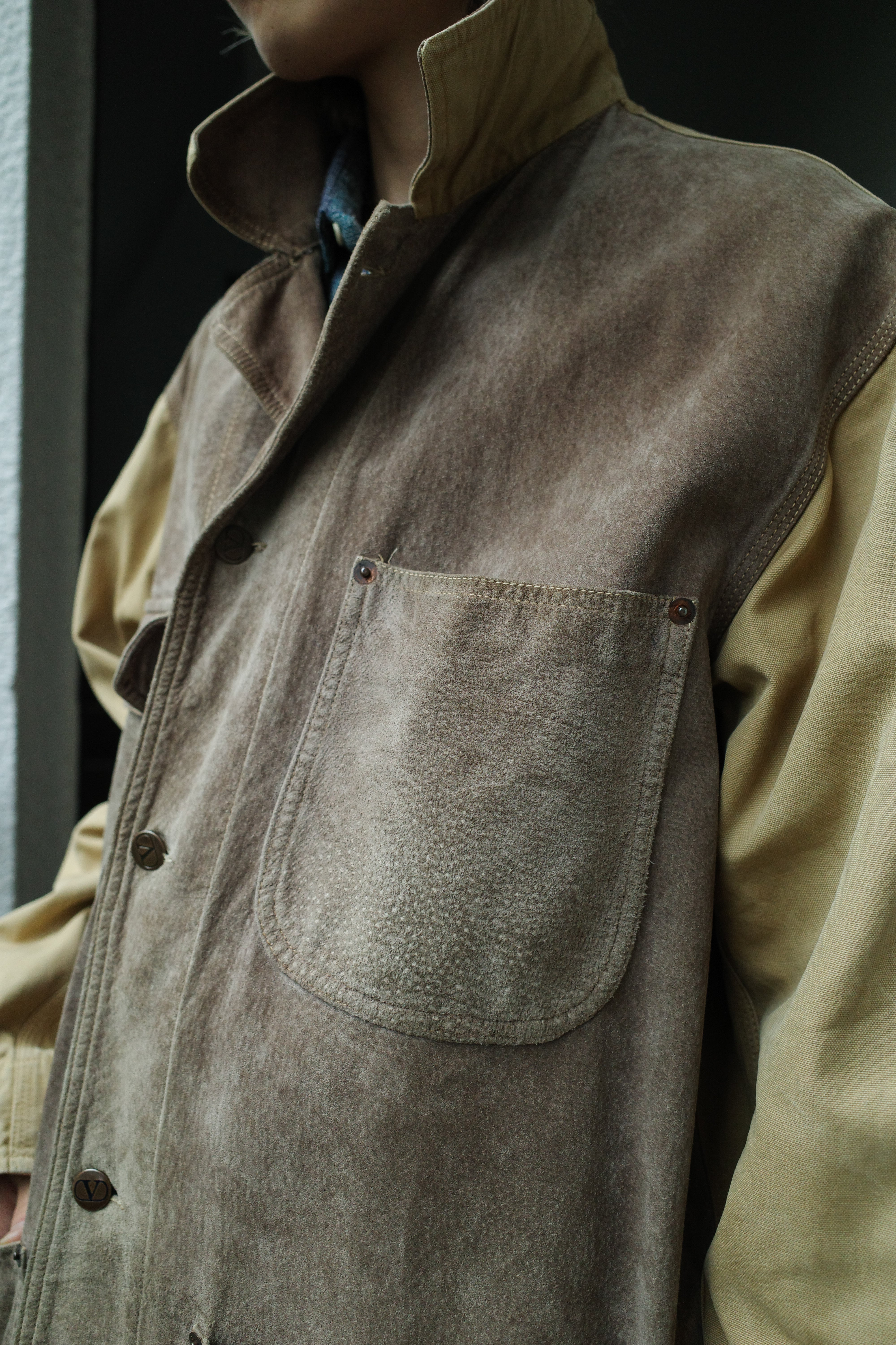 アメリカンヴィンテージのカバーオールをデザインソースに、フロントはピグスキンスエード、バックや袖はコットンダック生地に切り替えられています。