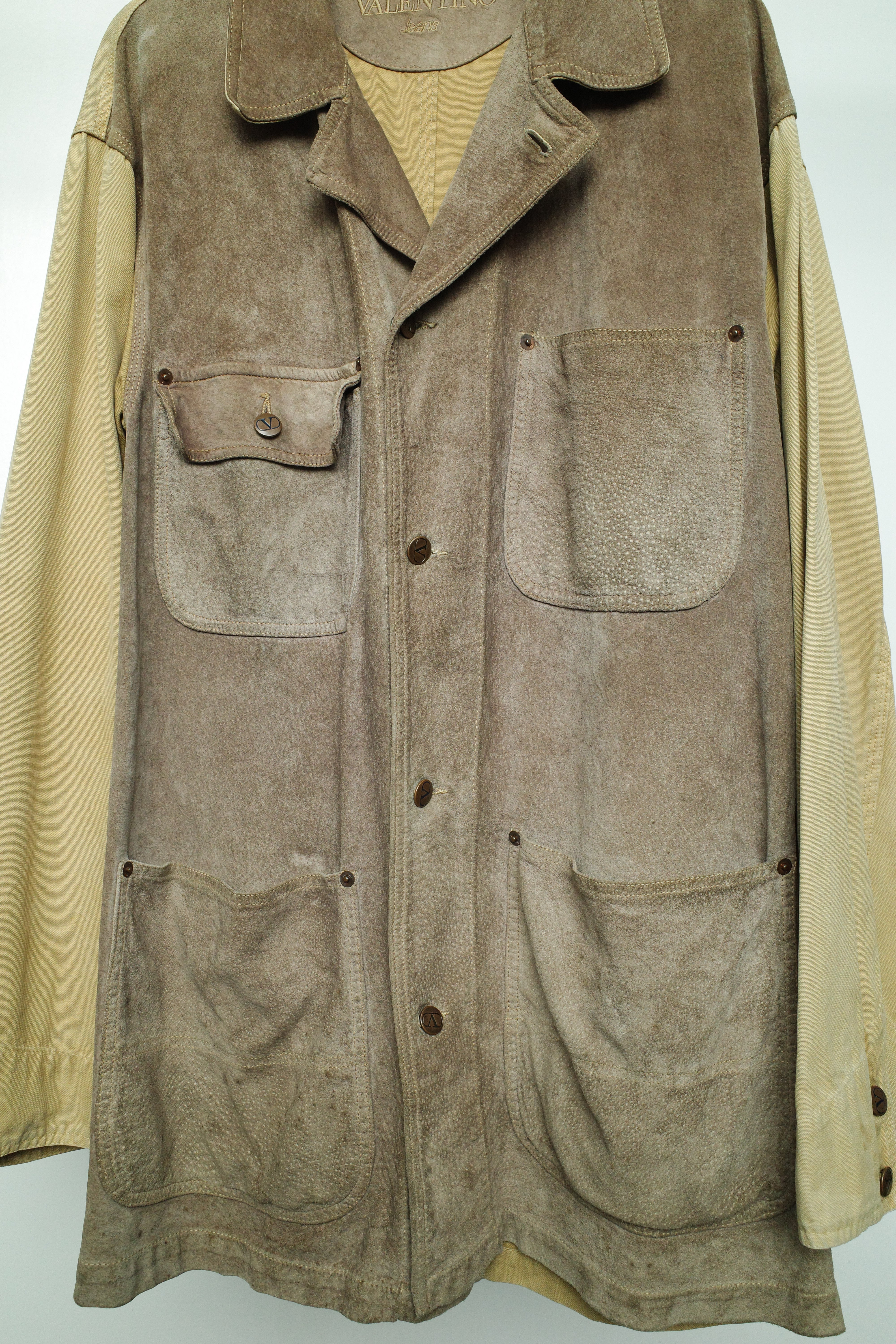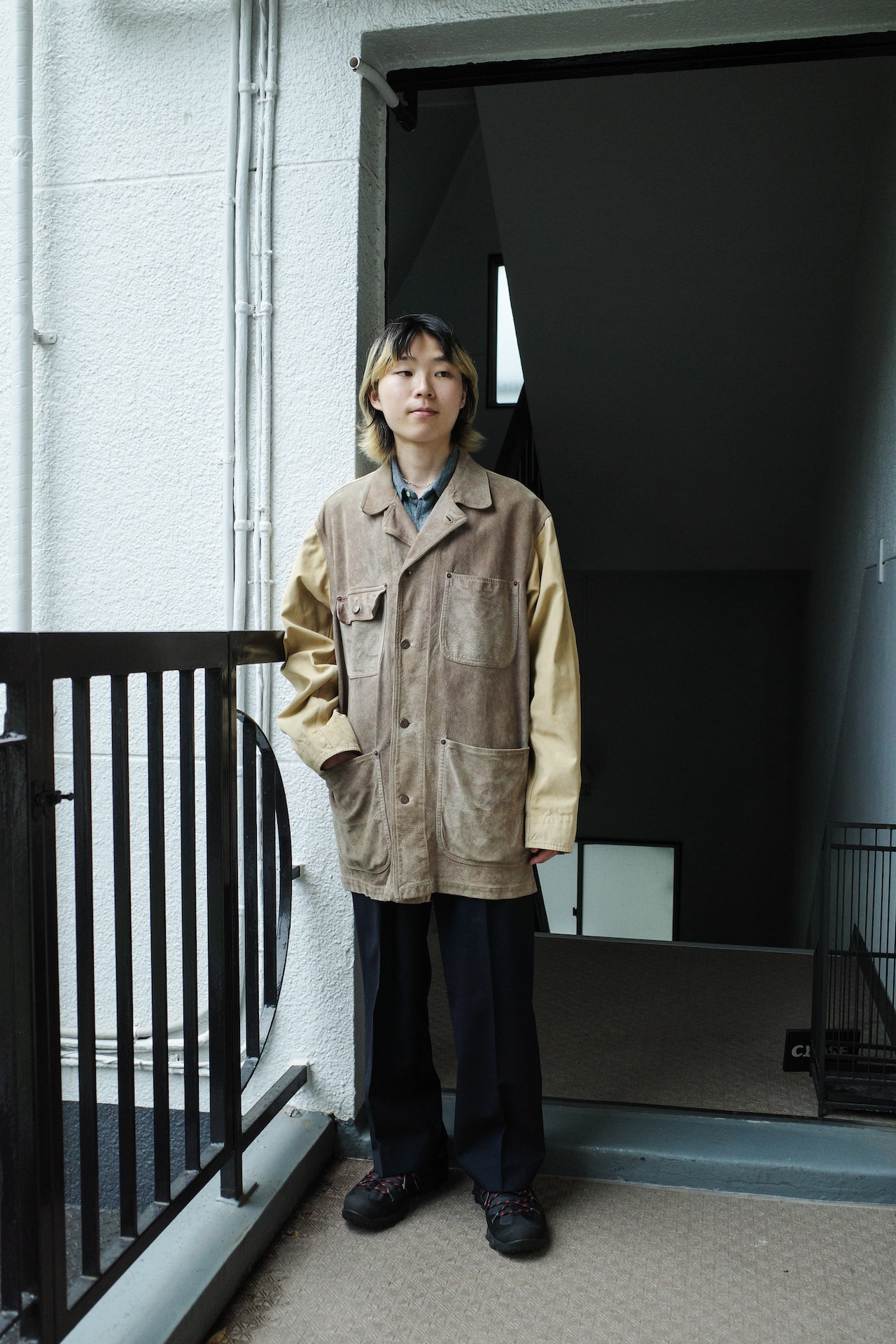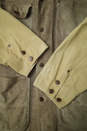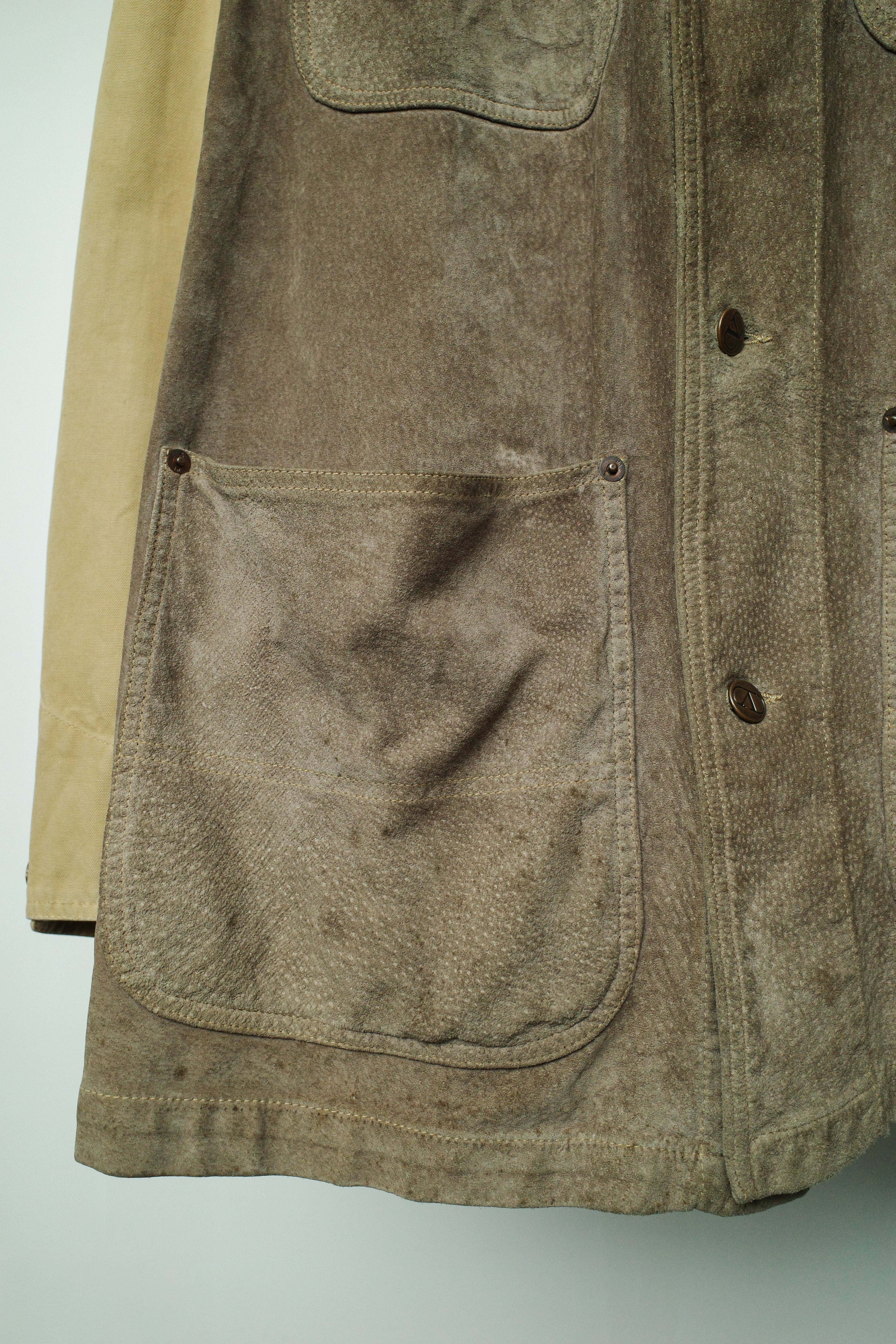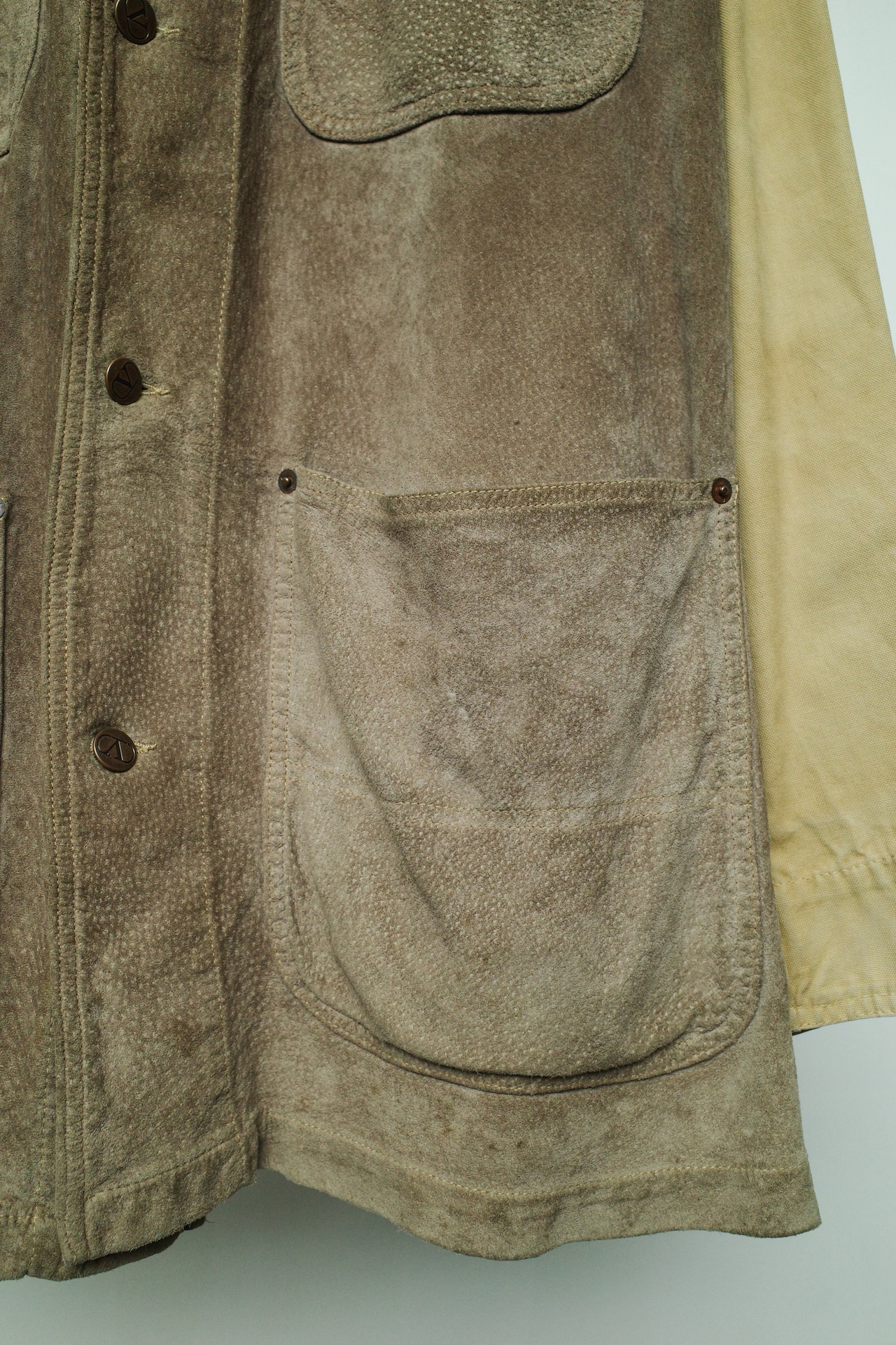 アメリカンヴィンテージのカバーオールをデザインソースに、フロントはピグスキンスエード、バックや袖はコットンダック生地に切り替えられています。