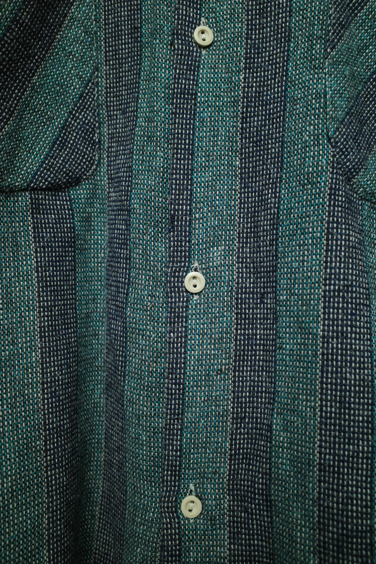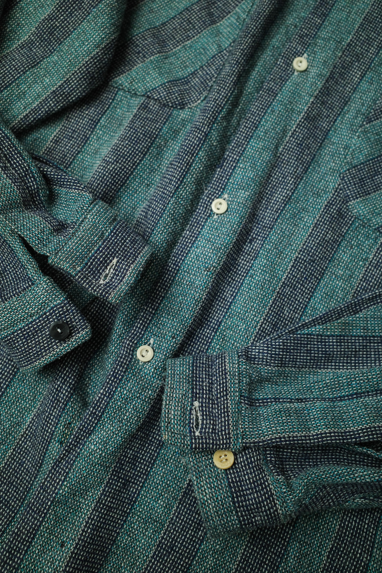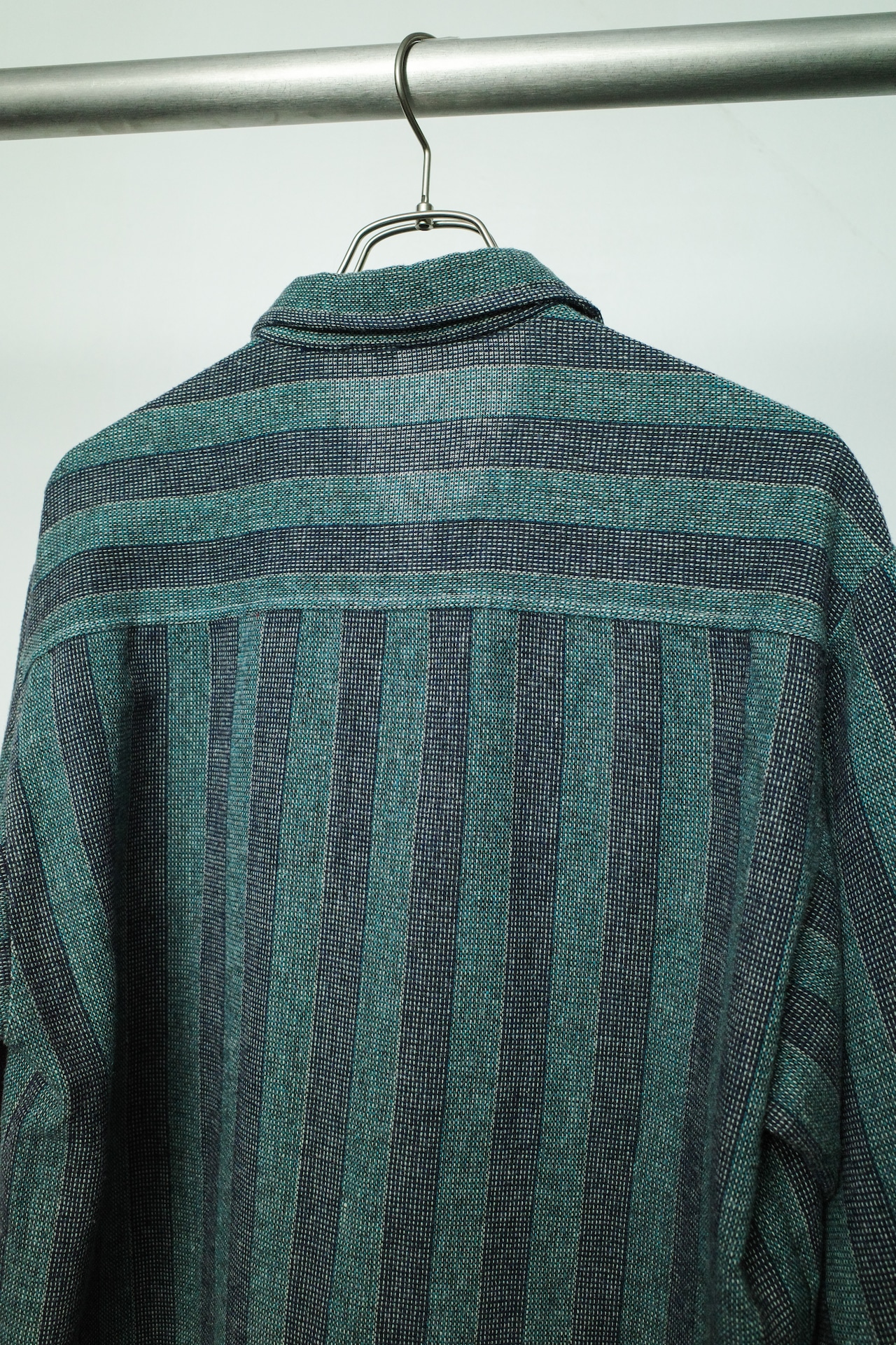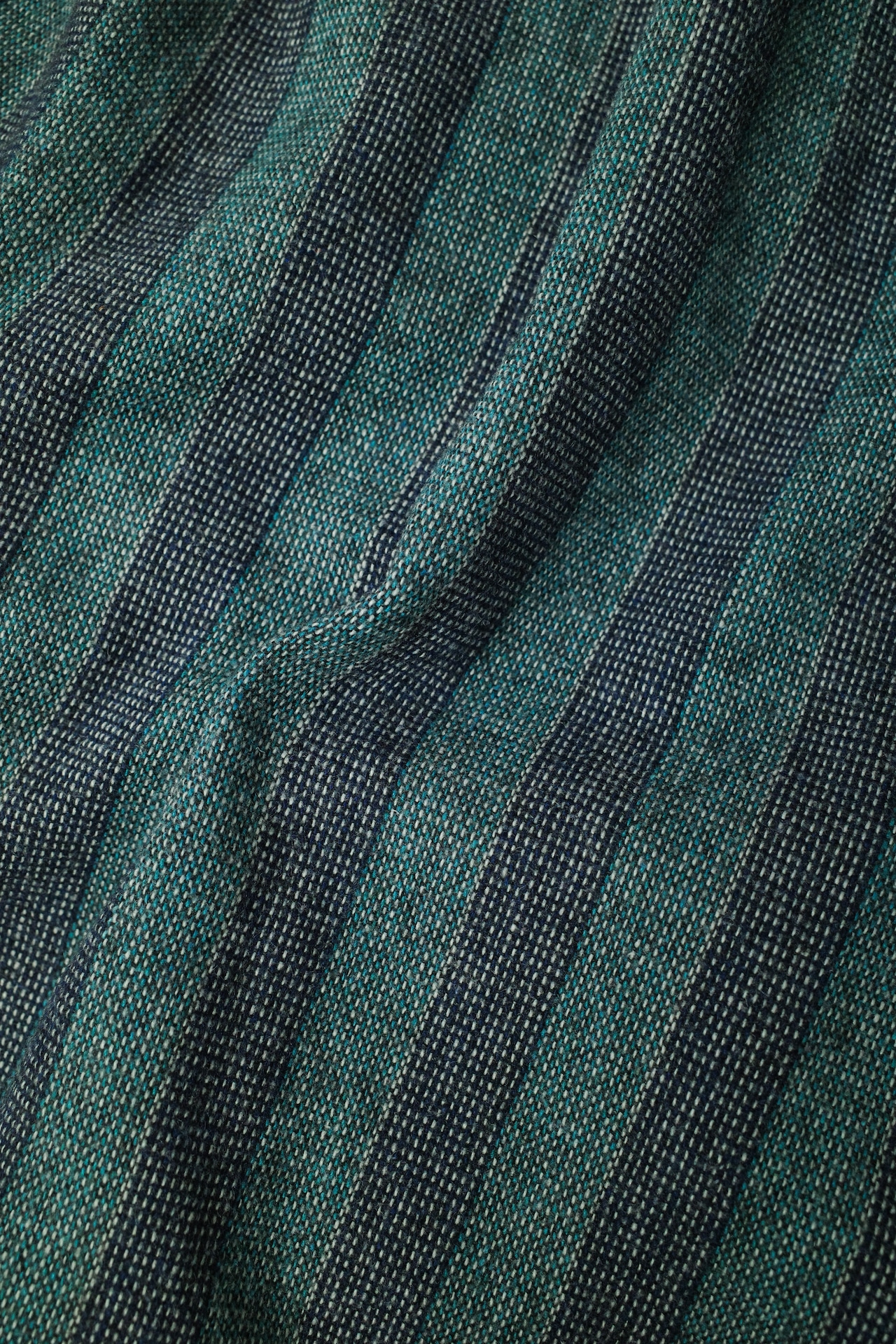 グリーンとネイビー、ホワイトの糸を平織りで優しく編み込んだ、風合いの良いストライプ柄。