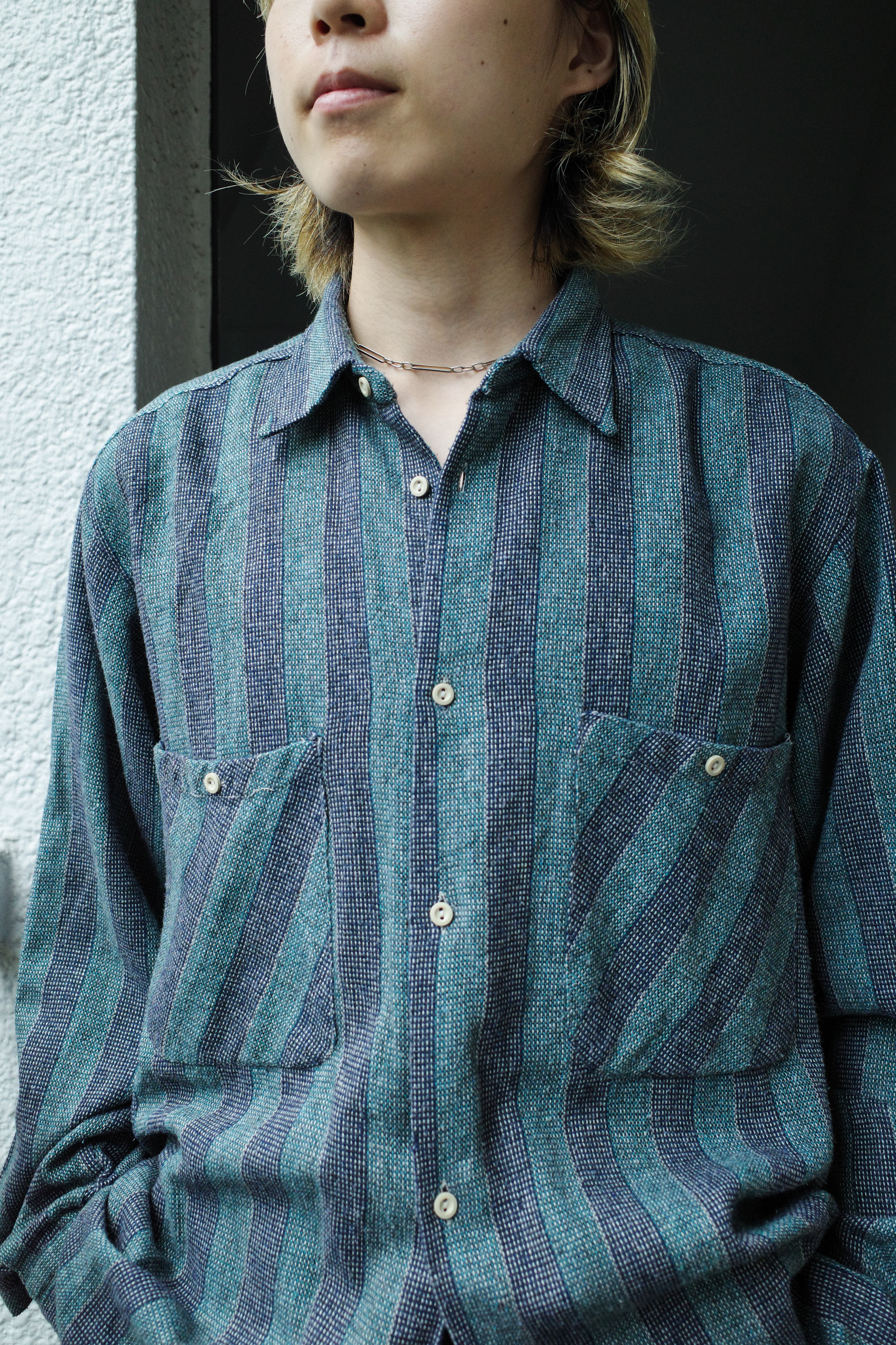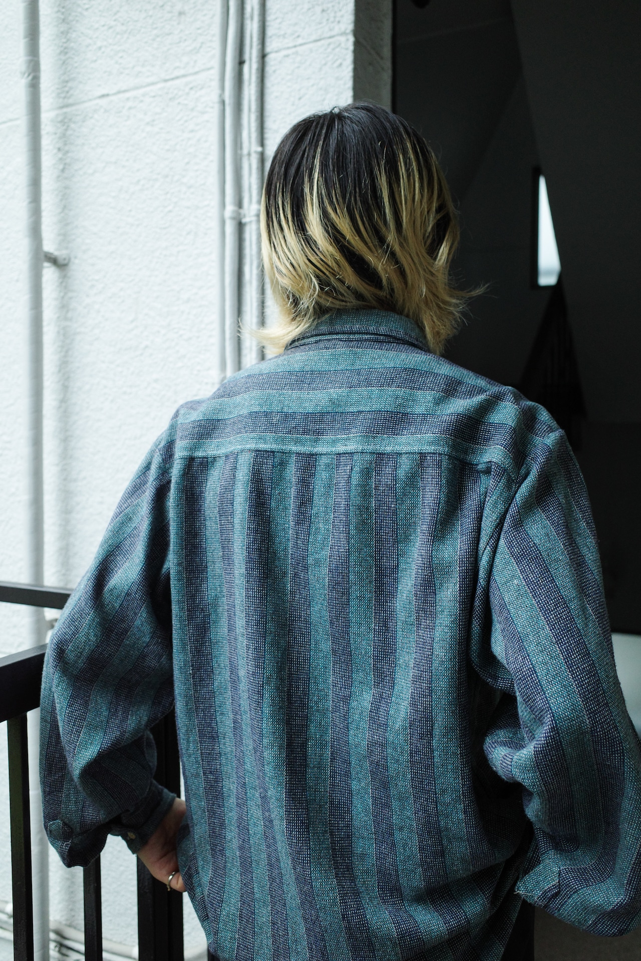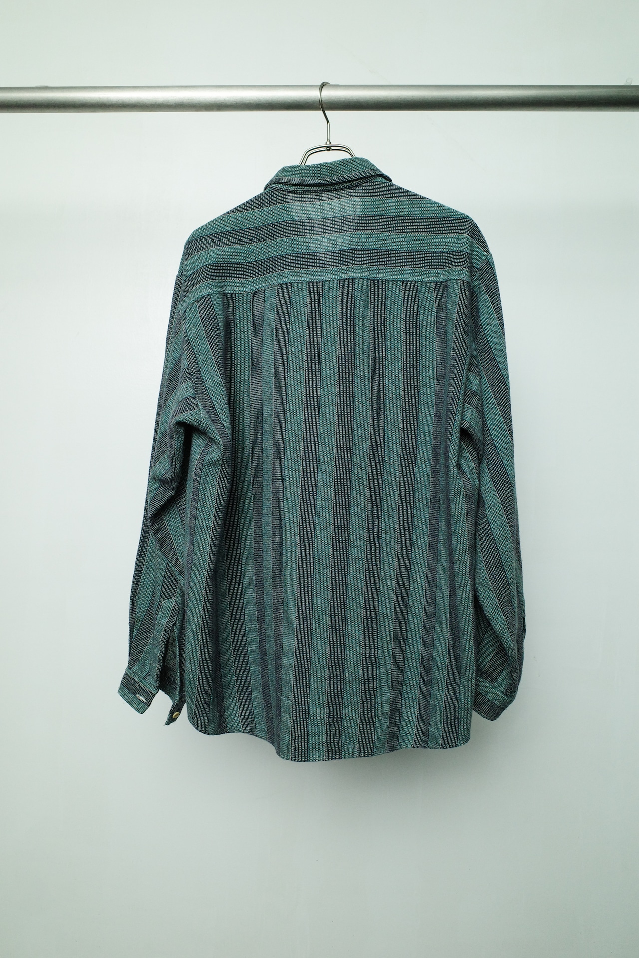 グリーンとネイビー、ホワイトの糸を平織りで優しく編み込んだ、風合いの良いストライプ柄。