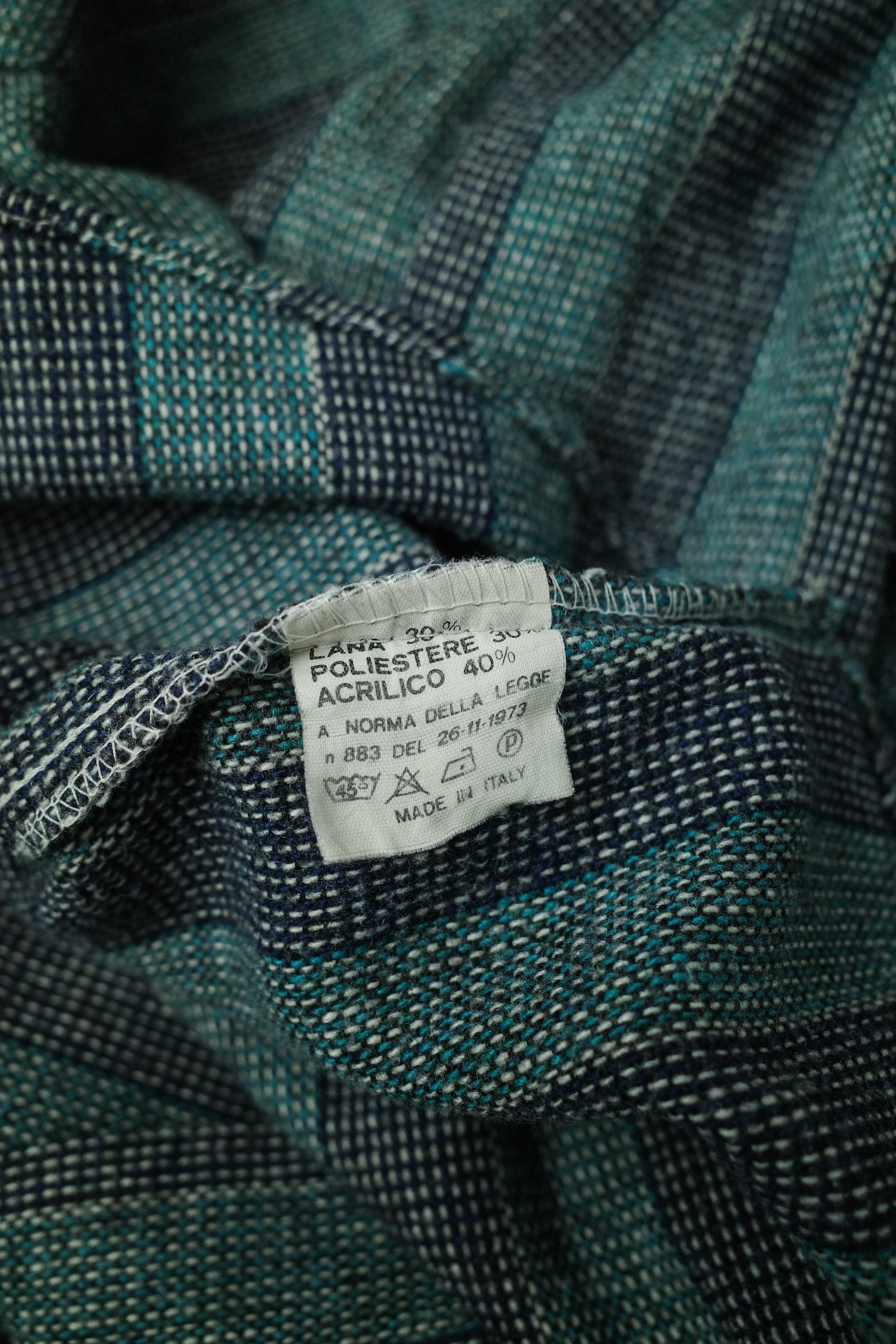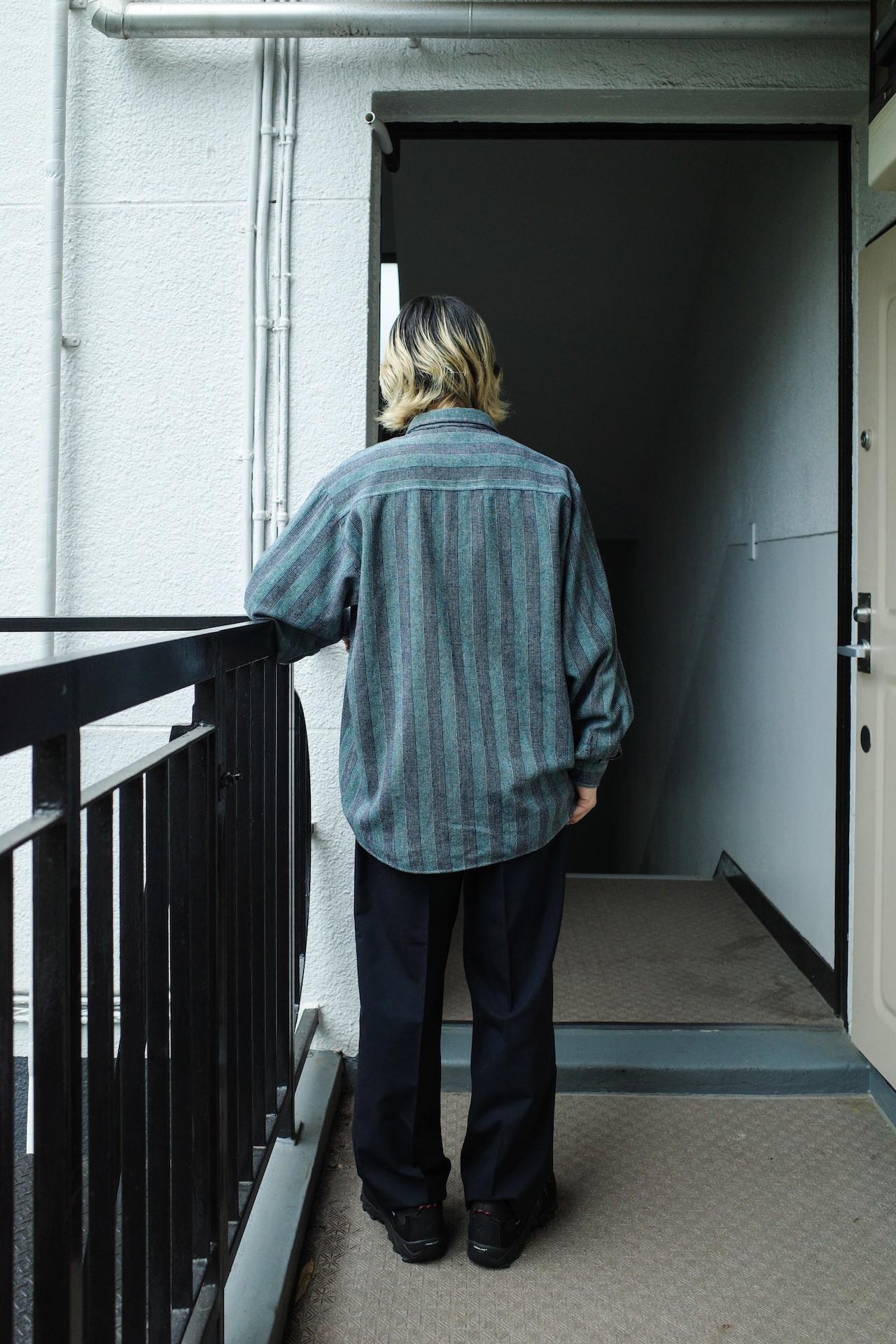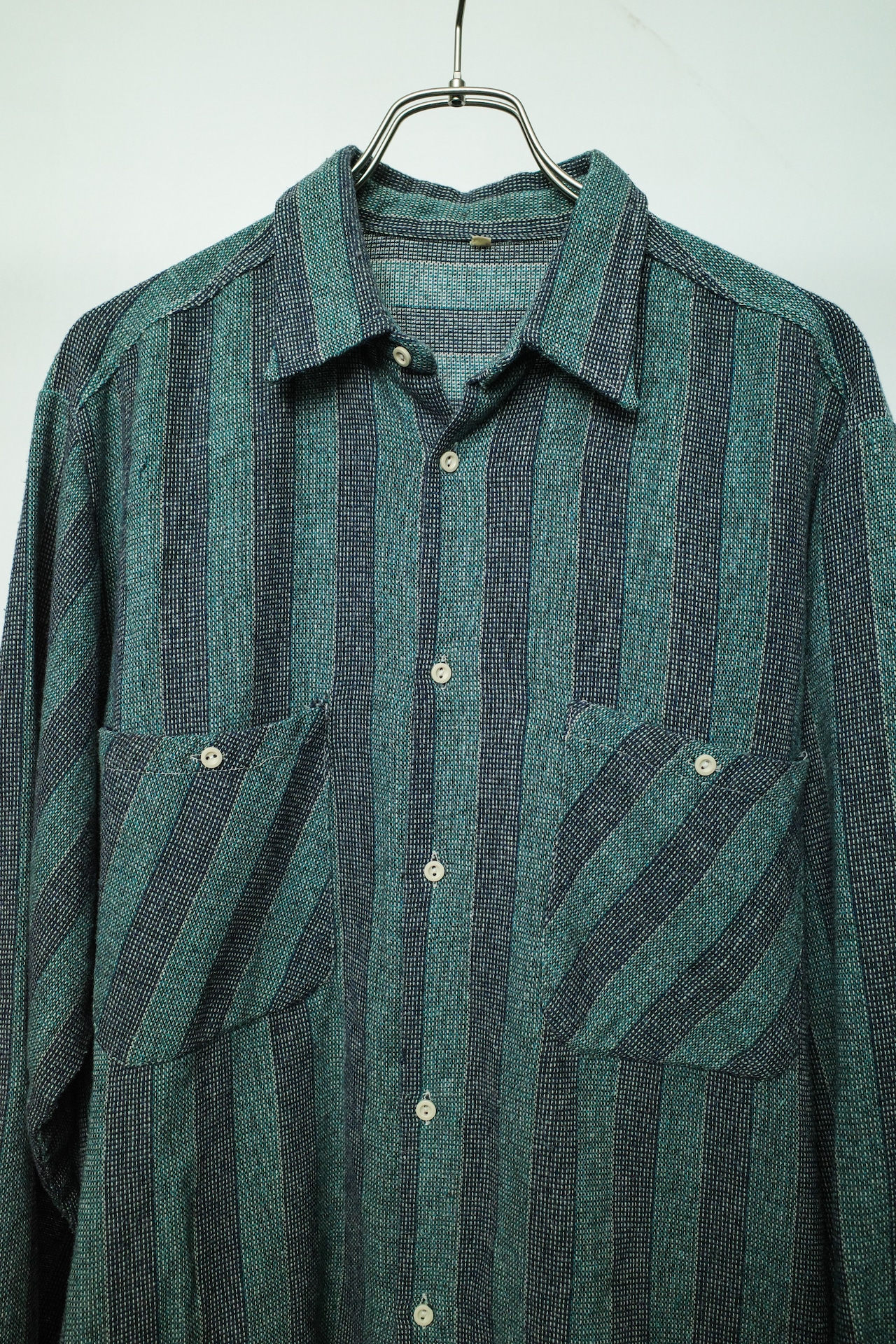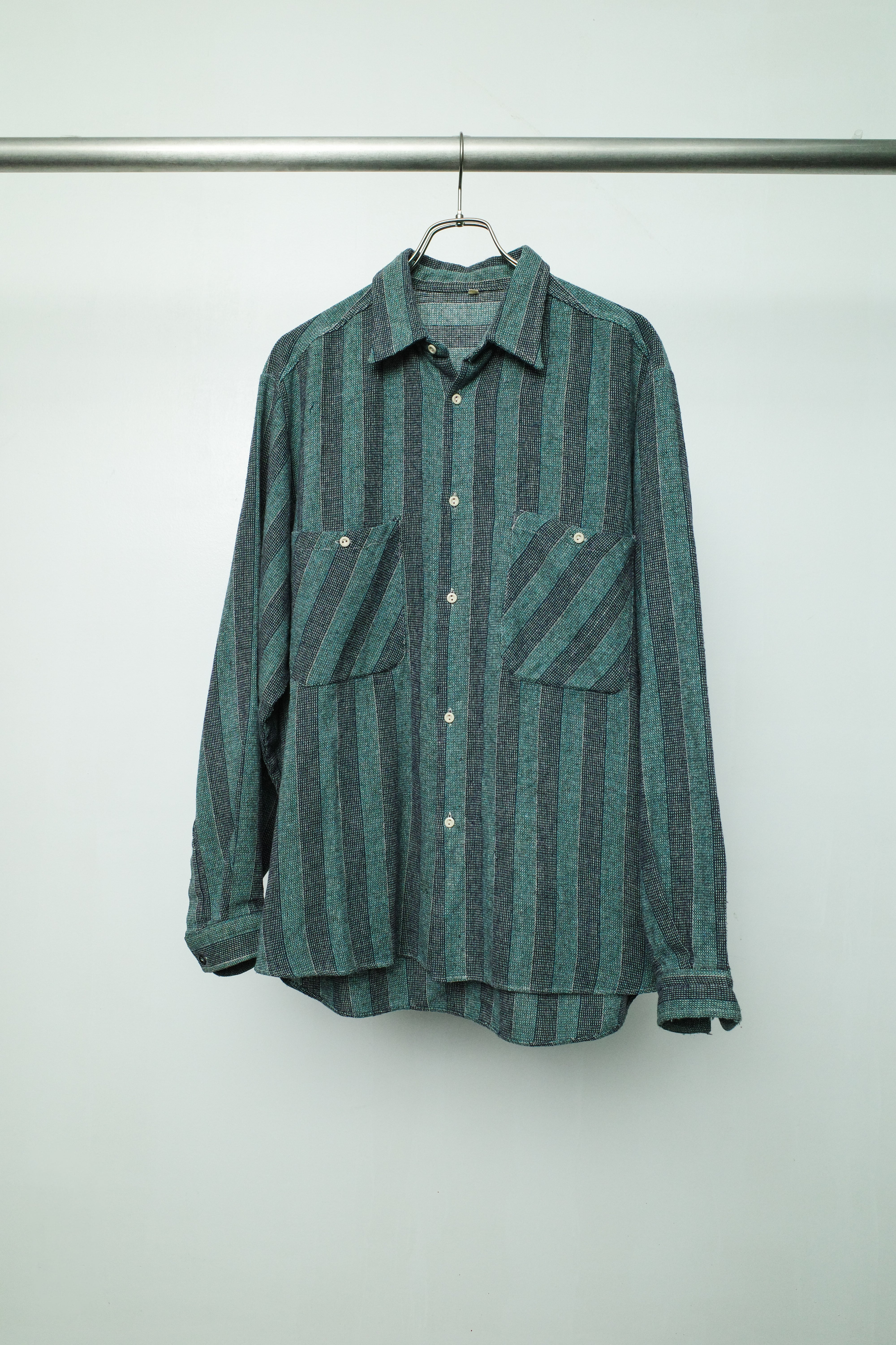 グリーンとネイビー、ホワイトの糸を平織りで優しく編み込んだ、風合いの良いストライプ柄。