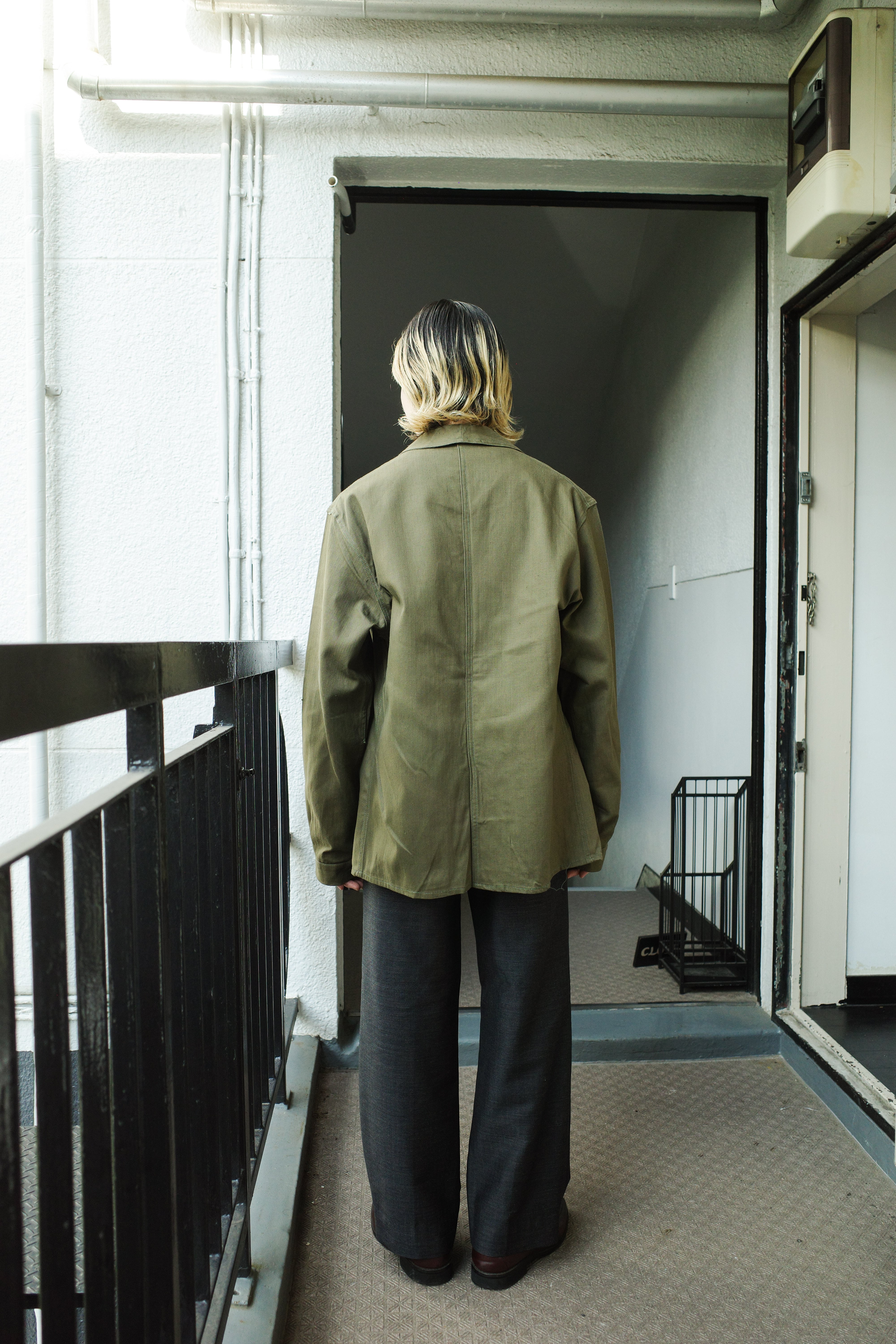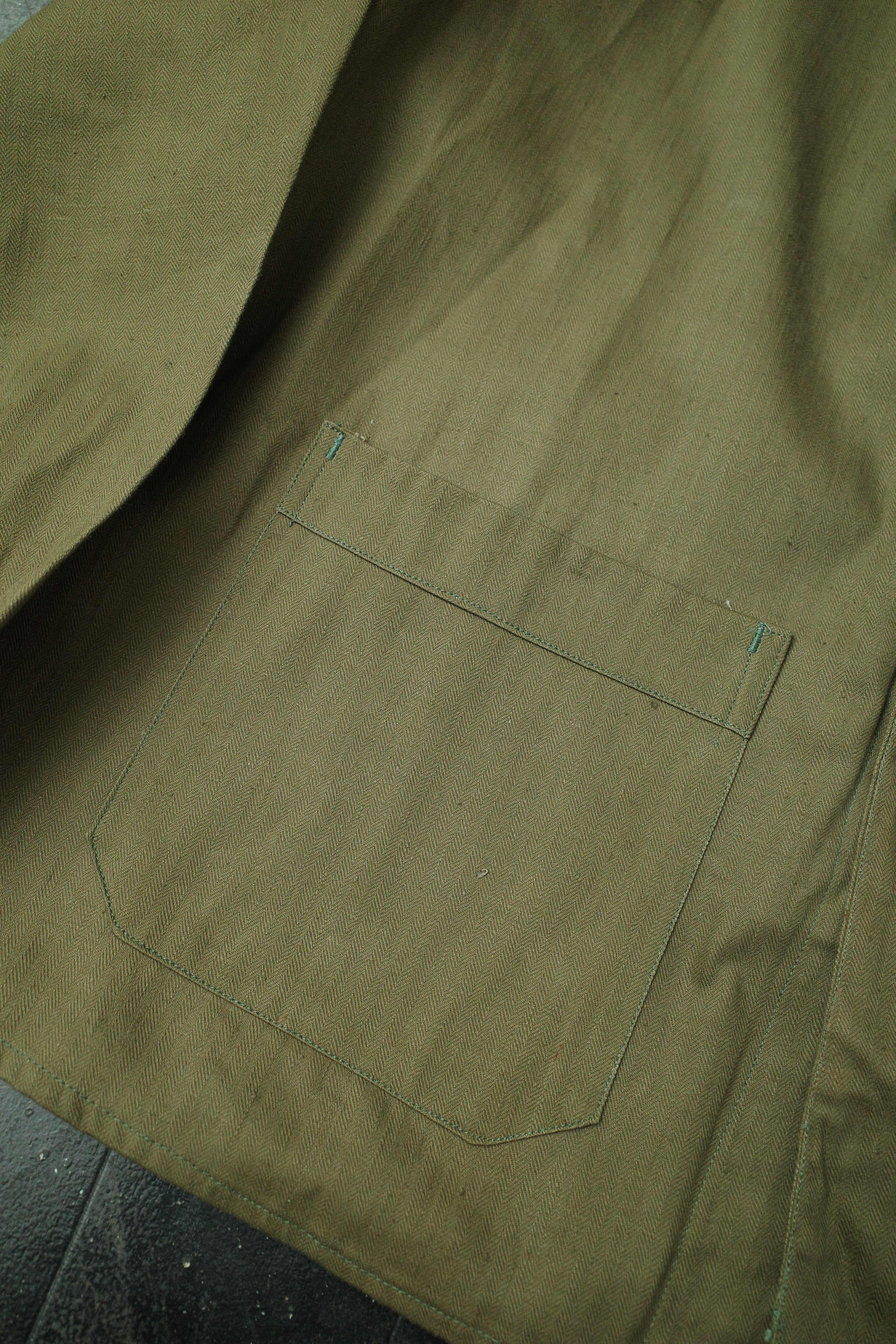 民間のワークウェアでは珍しい、ミリタリーのような深いオリーブカラーのHBT生地で作られた個体です。